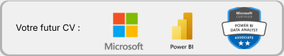 Reconnaissant votre expertise, la certification PL-300, anciennement DA-100, est hautement valorisée par les entreprises. Elle est reconnue par l'État et enregistrée au Répertoire Spécifique sous le code RS5445, ce qui en accroît significativement la valeur sur le marché de l'emploi.